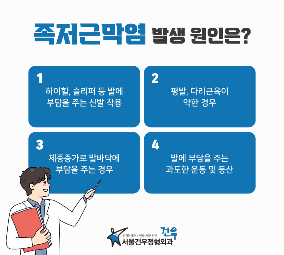족저근막염은 걷거나 서있을 때 발 발가락을 분리하는 역할을 하는 근육과 인대인 족저근막에 염증이 발생하는 질환입니다. 주로 발 아치에 통증이 나타나며 장시간 서있거나 걷는 활동을 할 때 특히 더 심해질 수 있습니다.