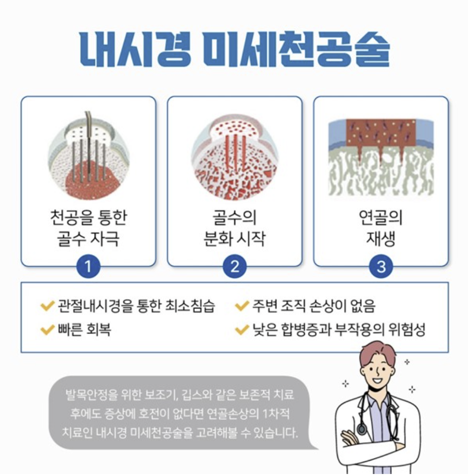 내시경을 이용해 손상된 연골을 복원하거나 수 리할 수 있는 기술적인 수술입니다.