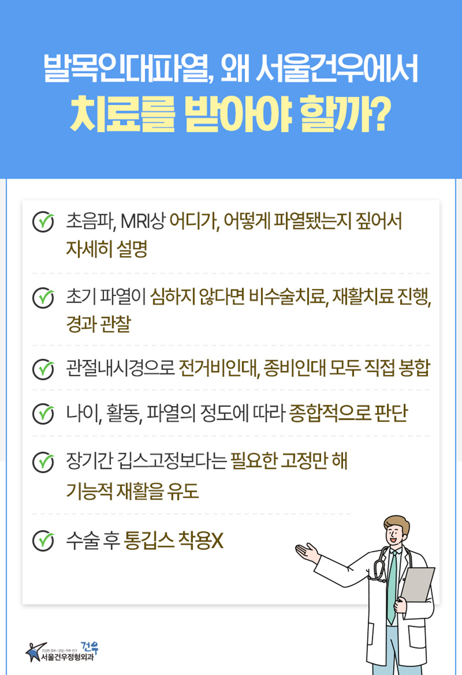발목인대파열은 조직간의 손상이므로 빠른 치료가 필요합니다. 처치를 늦게 받을 경우 고정 부위 주변의 근육이 더욱 약해질 수 있고, 더 많은 통증을 유발합니다. 또한, 부좁침이 심화될 가능성이 있어 일상생활에 지장을 줄 수 있습니다.