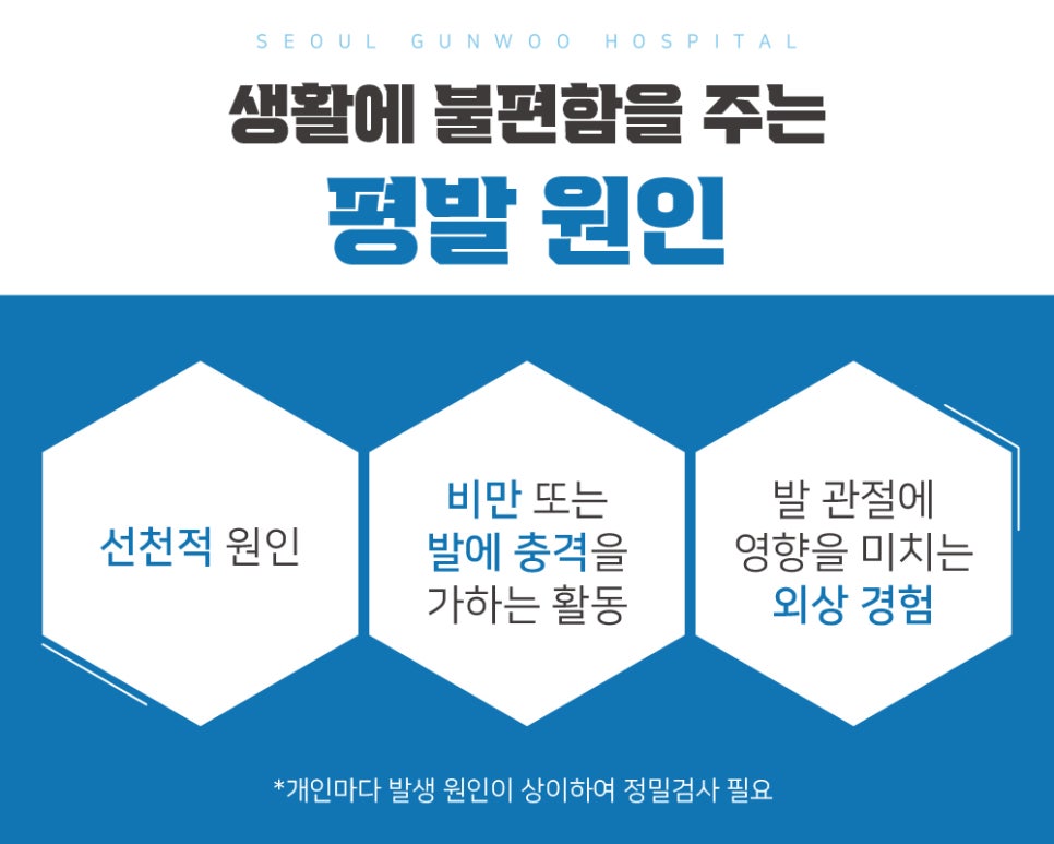 평발은 평소 발바닥이 통증을 유발할 수 있습니다. 특히 상일동정형외과에서는 발바닥 통증으로 많이 찾아오는 환자 중에 평발 환자도 많은 편입니다. 평발은 그 자체로 발의 안정성을 해치는 요인이 될 수 있기 때문에 발병부 말초신경이나 통증을 느낄 수 있습니다.